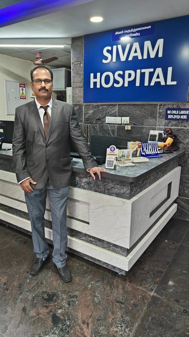 Sivam Hospital is a 40-bed multi-specialty facility offering advanced diagnostics and treatment across 9000+ sq. ft. over 4 floors. Founded by Dr. V. Sivakumar (MBBS, MS Ortho), the hospital is committed to providing high-quality, affordable care with transparency.
