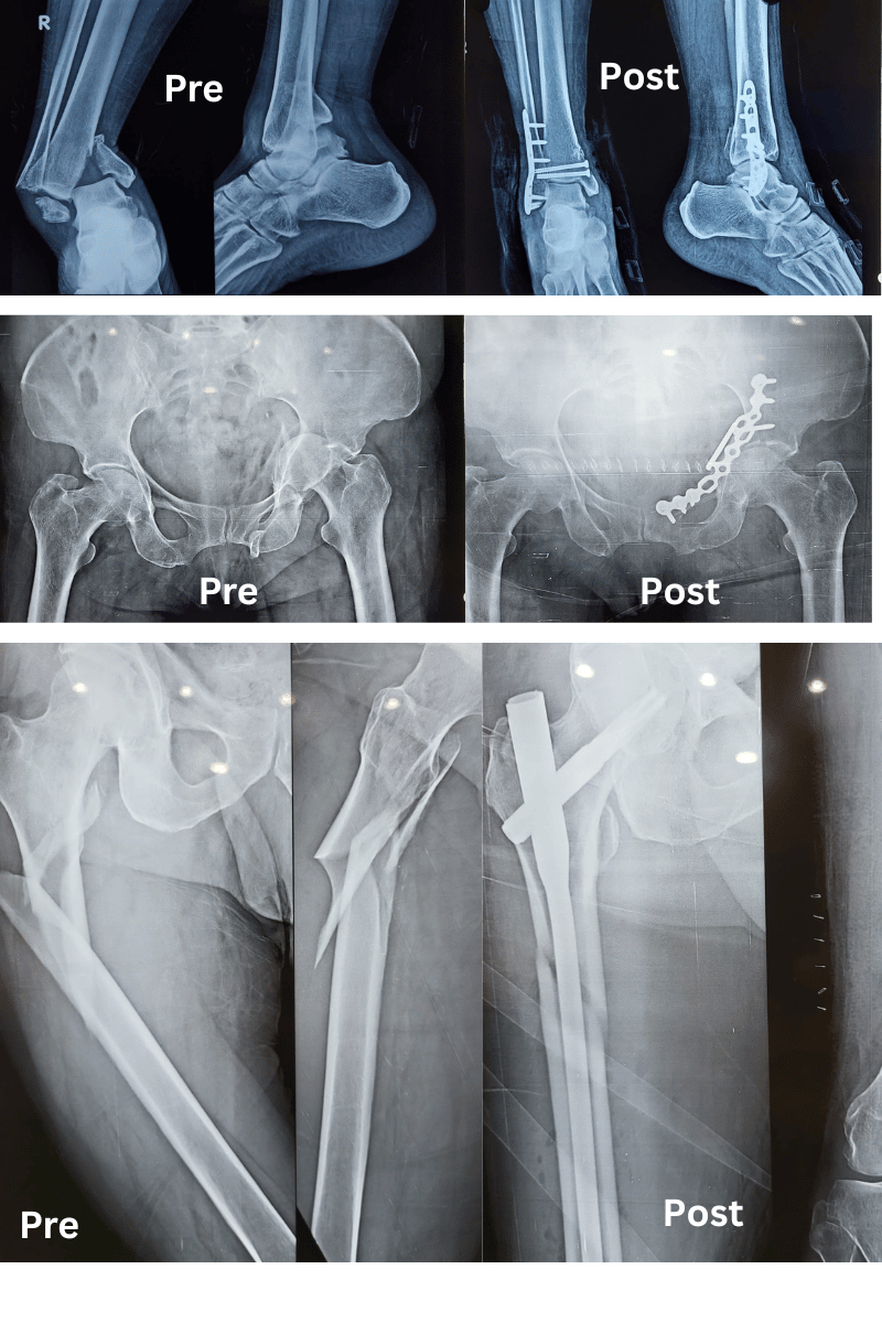 Major Fractures – Multimodal treatment to stabilise the patient immediately and team work to stabilise the fractures and other associated injuries (Head injuries, abdominal injuries)